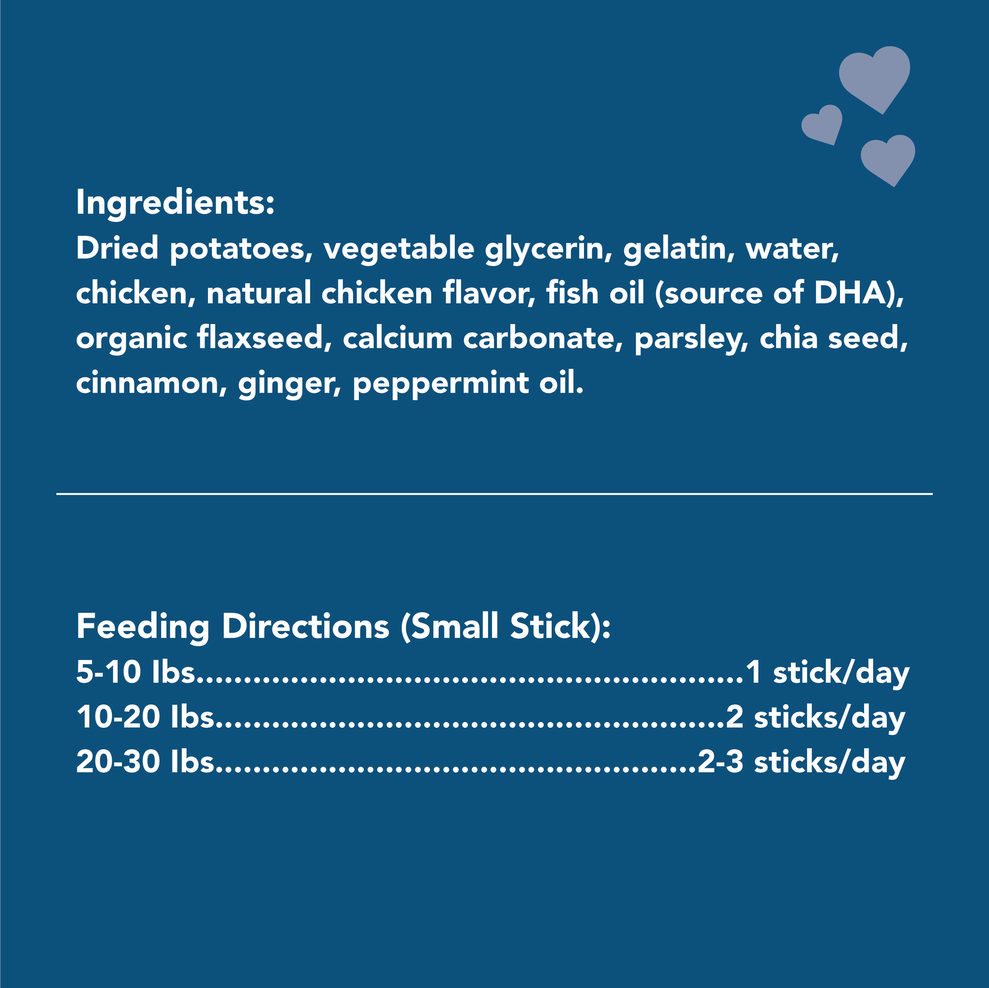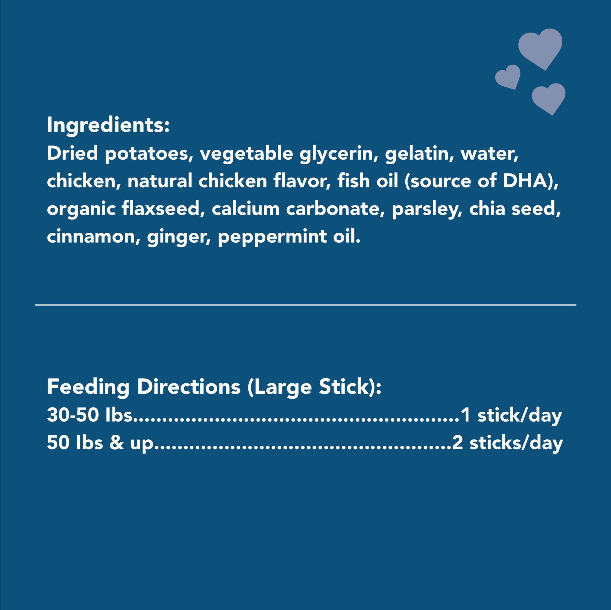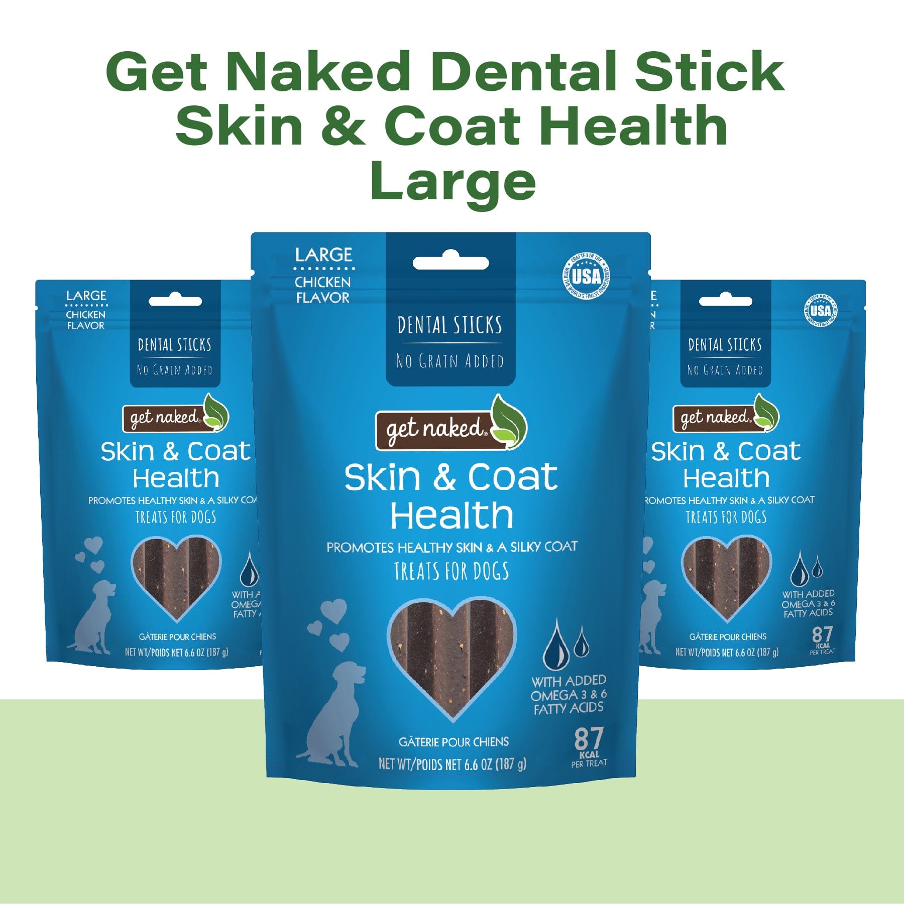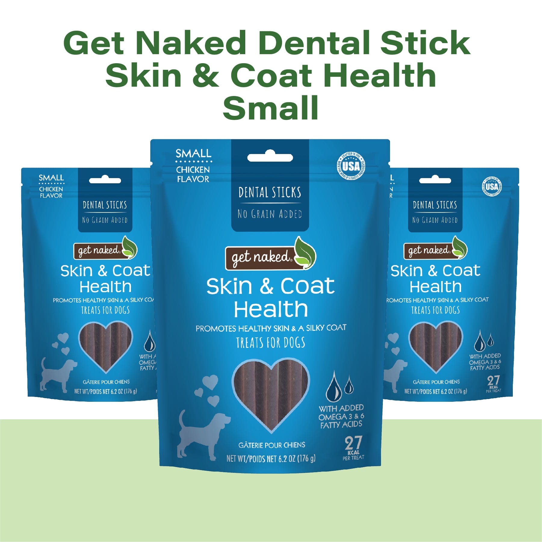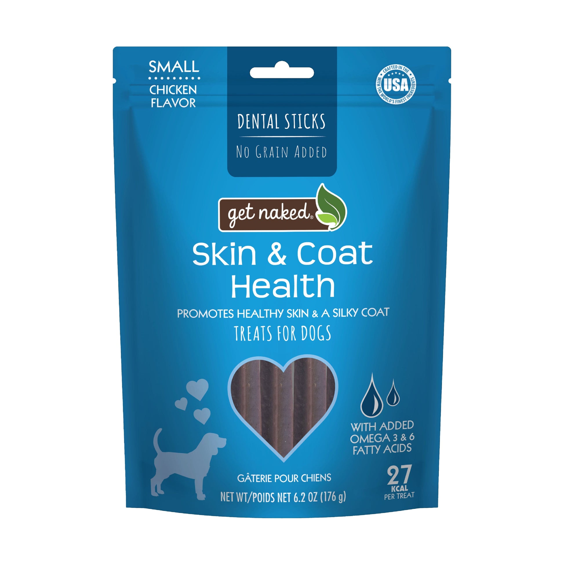 Get Naked® Skin & Coat Health dental sticks are grain-free treats formulated with a blend of omega 3 and omega 6 fatty acids to promote and maintain the health of your dog’s skin and coat. Just like you, your dog needs balanced nutrition for a healthy body and overall well-being. That’s why our Get Naked® Skin & Coat chews are made with quality wholesome natural ingredients. Our delicious chews will satisfy your dog’s cravings while promoting healthy skin and a lustrous coat.