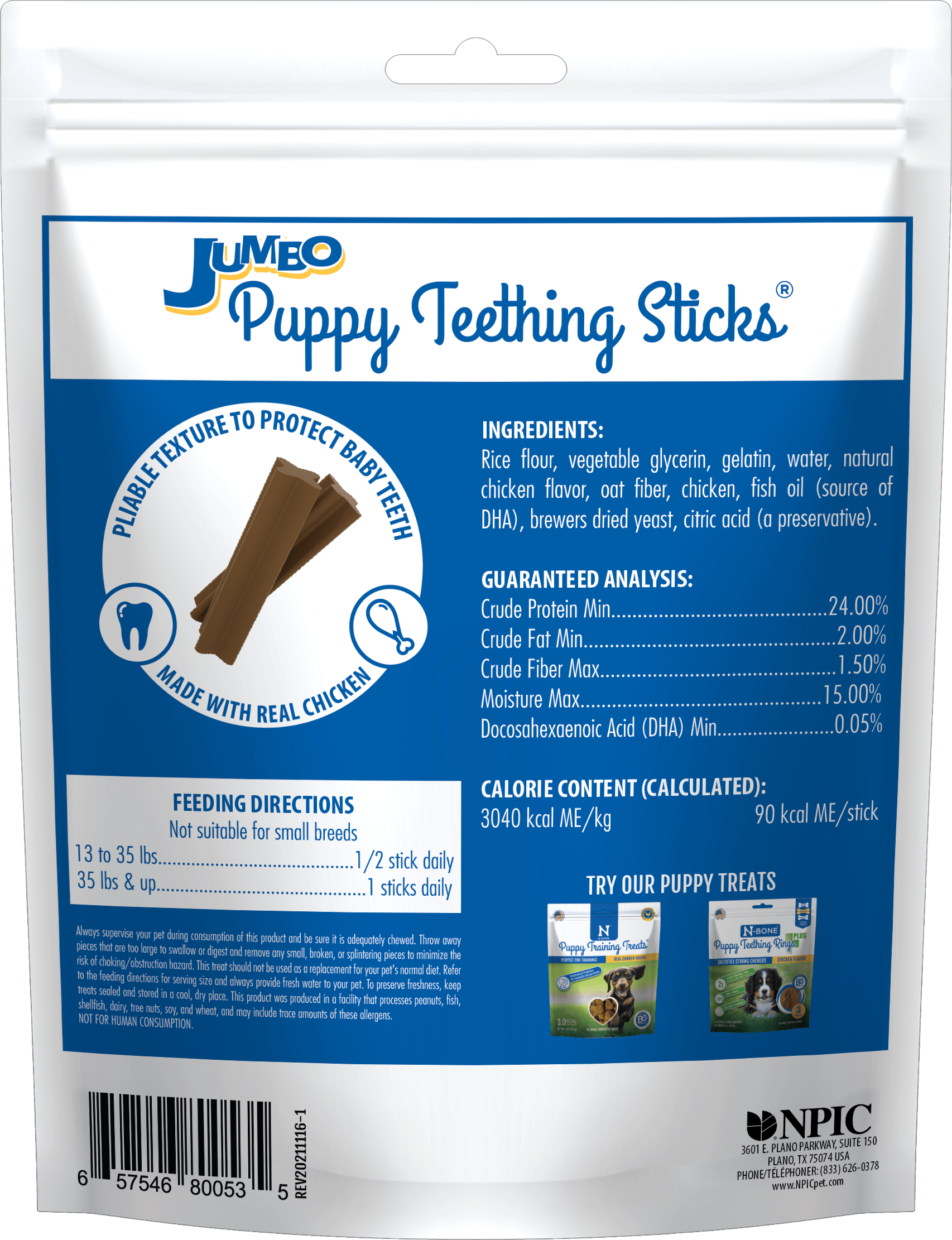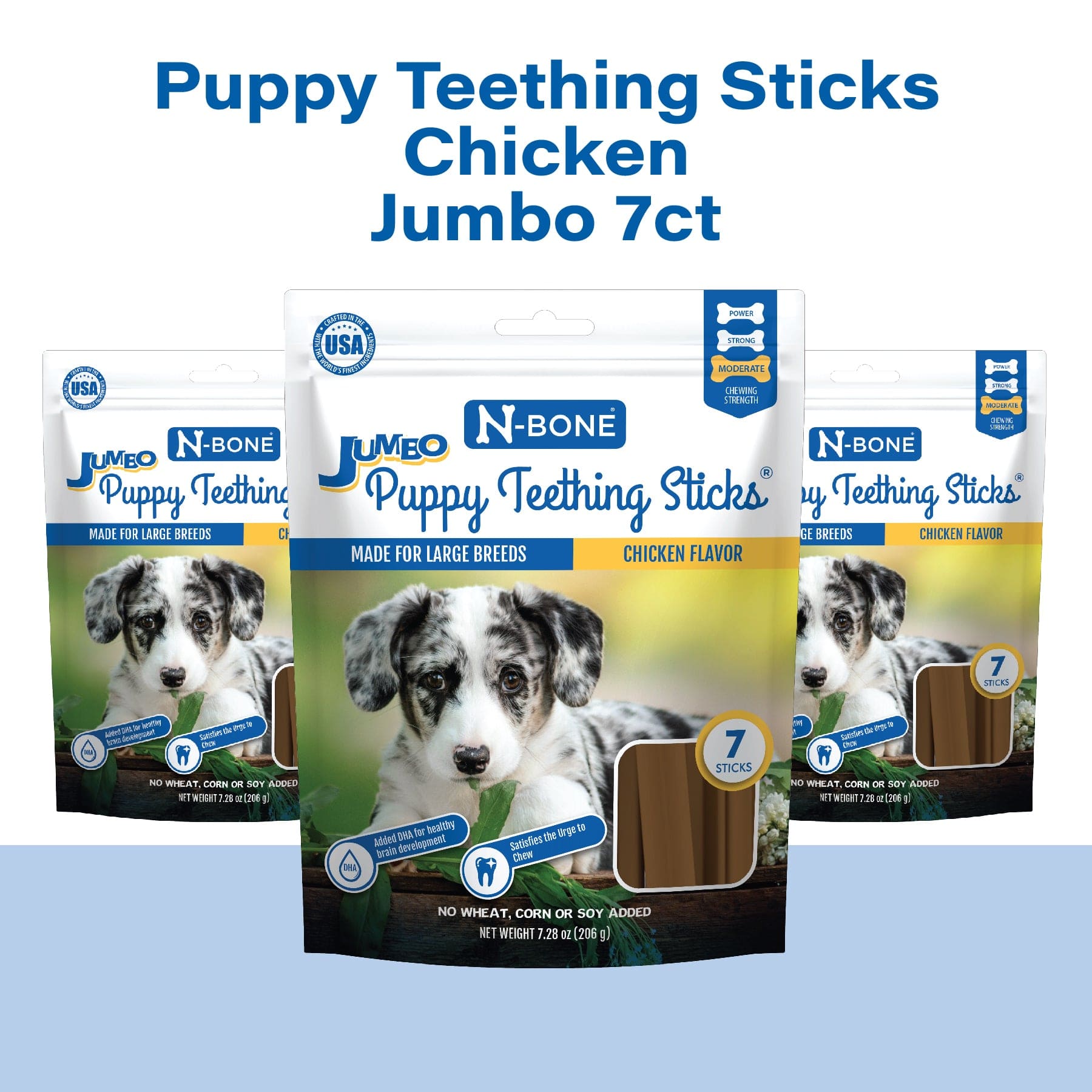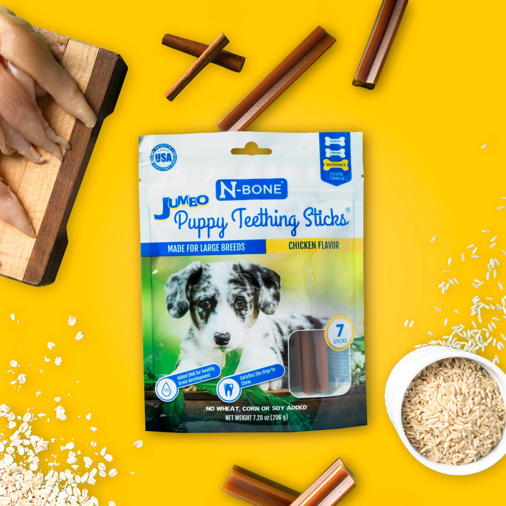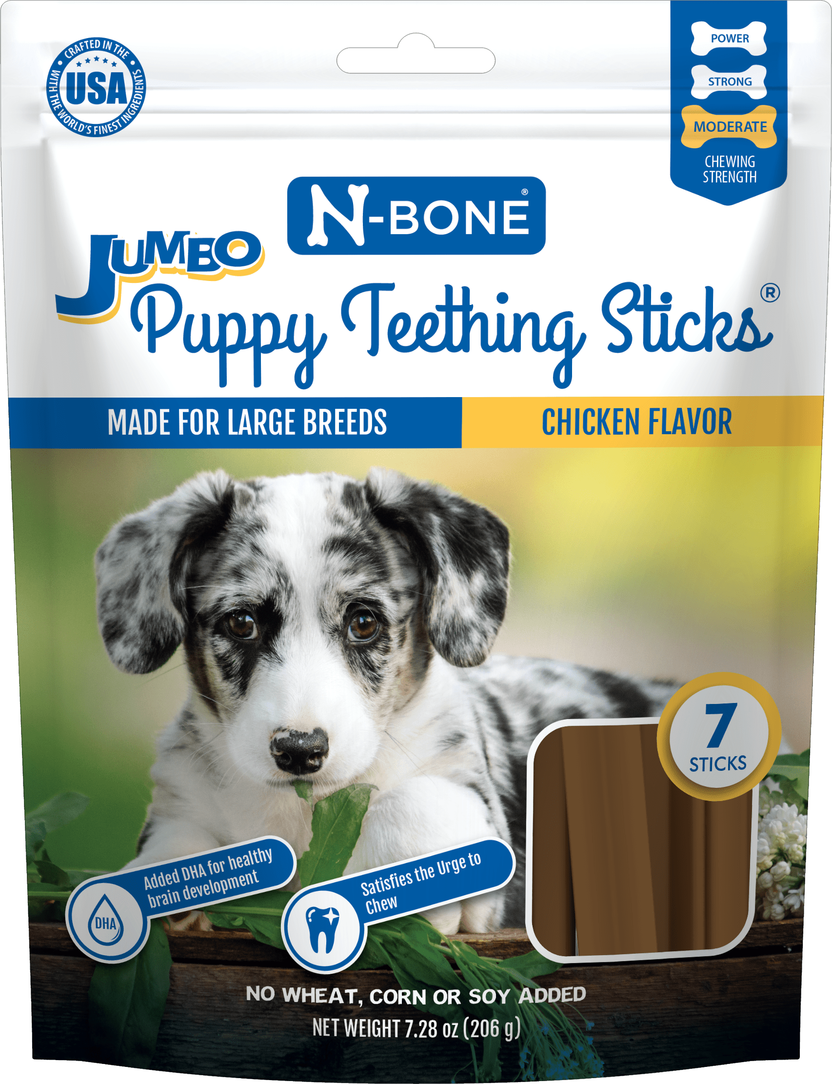The N-Bone® Jumbo Puppy Teething Sticks are here! Designed specifically for large breeds, the sticks alleviate the teething pain and massage the sore gums, while providing necessary nutrition for your pup’s development. Available in the puppy-favorite Chicken flavor. It is time to give your pup a delicious treat!