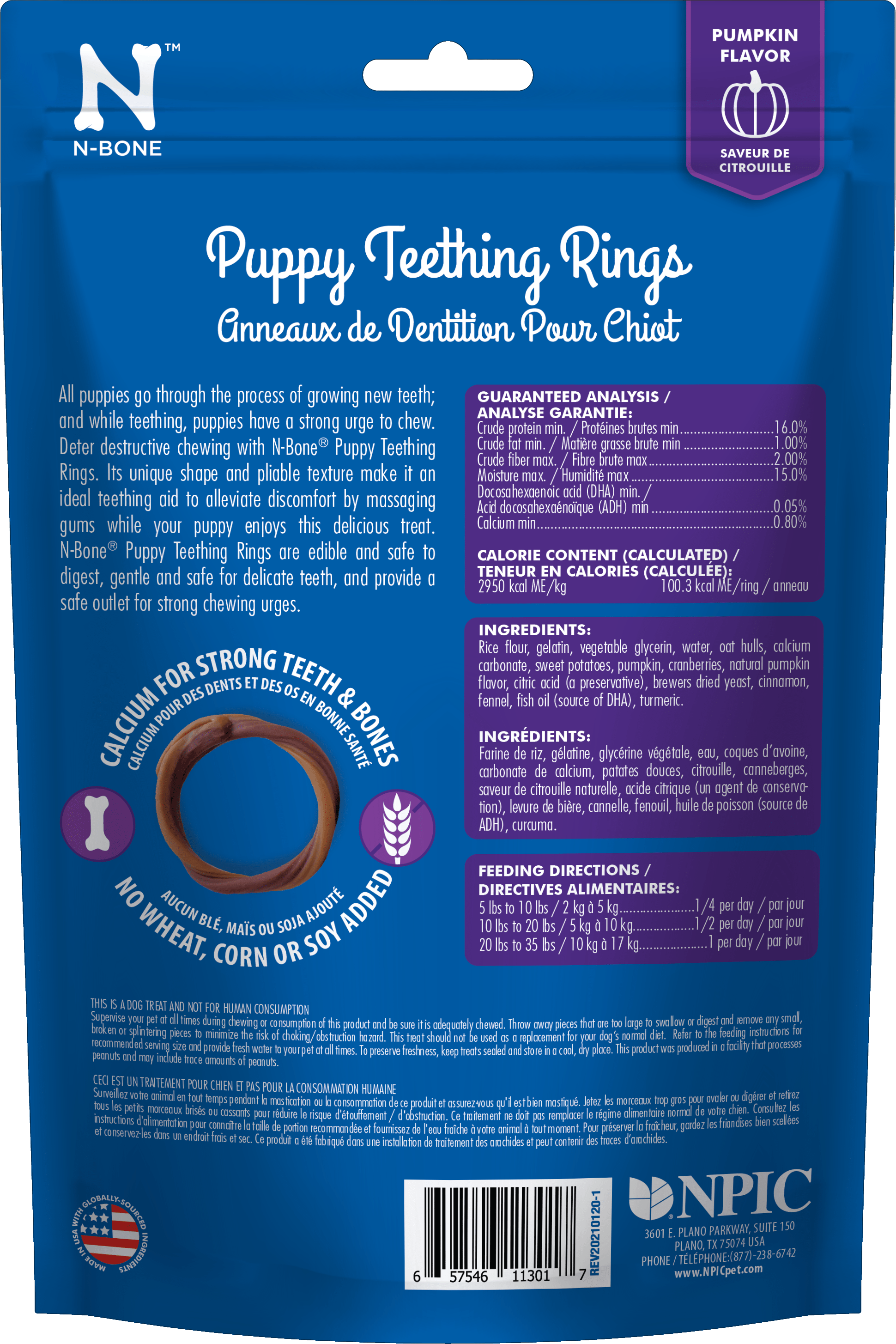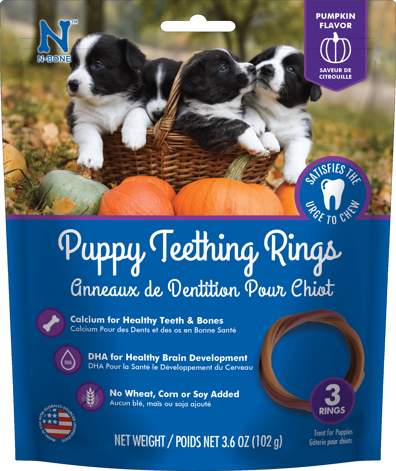 Growing new teeth is tough work and it makes for some sore gums! Sore gums and a strong urge to chew while cutting new teeth can turn your precious puppy into a whirlwind of destruction. N-Bone® Puppy Teething Rings are easy for floppy puppy paws to hold onto and provide a soothing and appropriate outlet for chewing. Formulated with DHA and calcium to support your puppy’s unique nutritional needs, our delicious pumpkin flavored rings are pliable and won’t damage immature teeth.