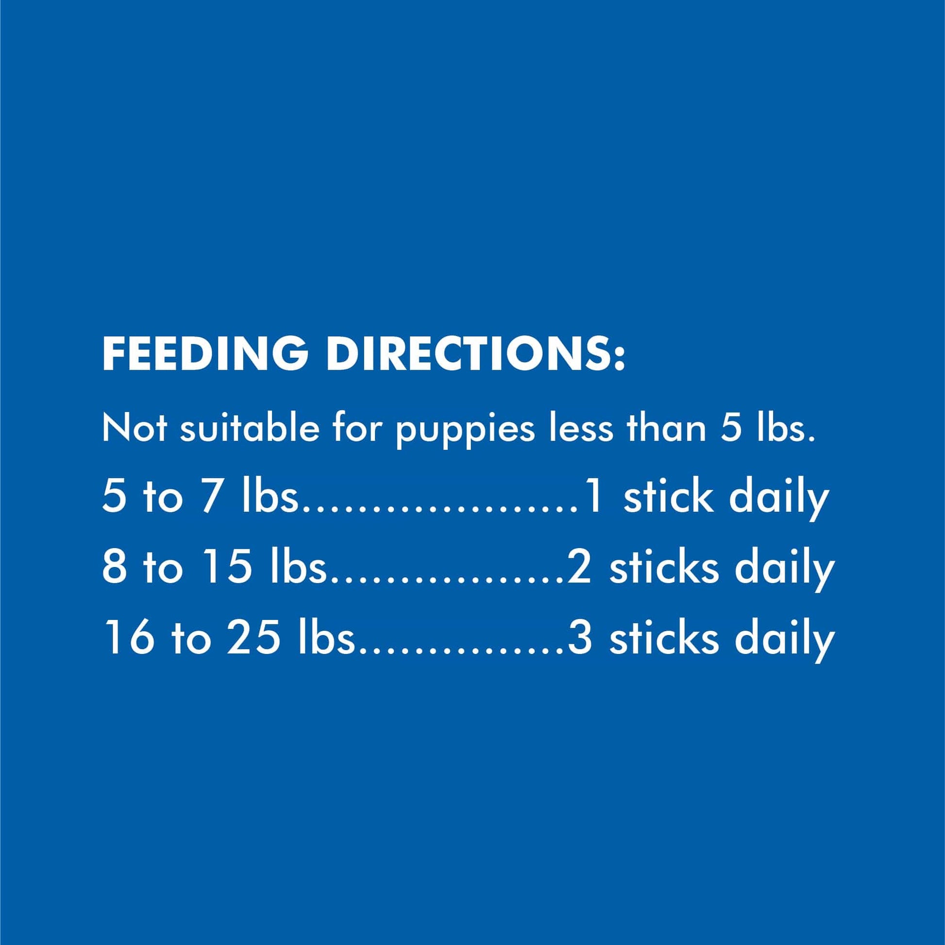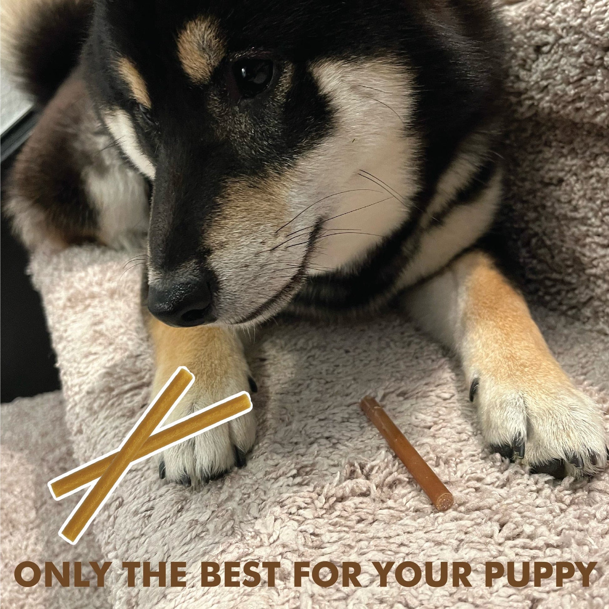 Chewing is a natural behavior for dogs so proper care of the teeth and gums starts at a very early age. The teething period begins once the adult teeth start to come in, which causes pain and soreness in the teeth and gums. Chewing helps alleviate the pain and soreness but hard chew treats can damage or break immature teeth. Any damage or breakage to immature teeth can expose the nerve so the proper chew treat is critical to the development of teeth and gums. Puppy Teething Sticks are flexible, pliable and safe for a teething puppy because the gummy or chewy texture of the treat will not break or damage immature teeth.